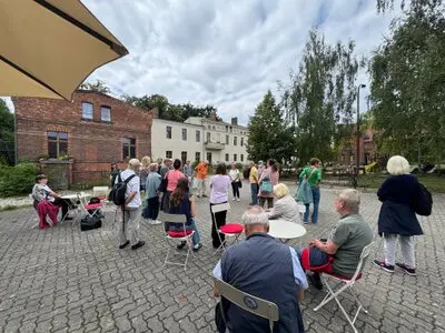 Das Leben im StadtGut von heute führte uns - nach Kaffee und Kuchen - Herr Elmar Langner in einem 45-minütigen Rundgang begeistert und begeisternd vor Augen. Durch die Vereinsgründung 2004 - StadtGut Blankenfelde e.V. - ist es im Laufe der Zeit gelungen, für ca. 100 Personen Wohnraum zu schaffen, die dem Mietmarkt entzogen sind und zu günstigen Mietpreisen überlassen werden können. Allein wie das durch komplizierte Verknüpfungen gemeinnütziger Vereine geschafft wurde, ist spannend genug.