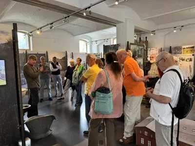 Etwa 30 Personen nutzten die Gelegenheit sich in der Ausstellung im Café Traktorista über die Geschichte des Ortes und seine besondere Bedeutung für Berlin zu informieren. Nach einer kurzen Begrüßung durch den Vereinsvorsitzenden, Ulf Sobeck, ließ Herr Matthias Roch vom Museum Pankow in der Führung an plastischen Beispielen und Informationstafeln die Geschichte lebendig werden. Als die Cholera in Berlin viele Opfer erforderte und Wissenschaftler deutlich machten, dass unreines Wasser die Ursache dafür war, sorgte der damalige Magistrat von Berlin - aus heutiger Sicht sehr zügig - dafür, dass die Abwässer der Großstadt durch große Rohre auf die Rieselfelder um Blankenfelde aus der Stadt geschafft wurden. Erst Mitte der achtziger Jahre wurde diese Entsorgung durch modernere Kläranlagen ersetzt.